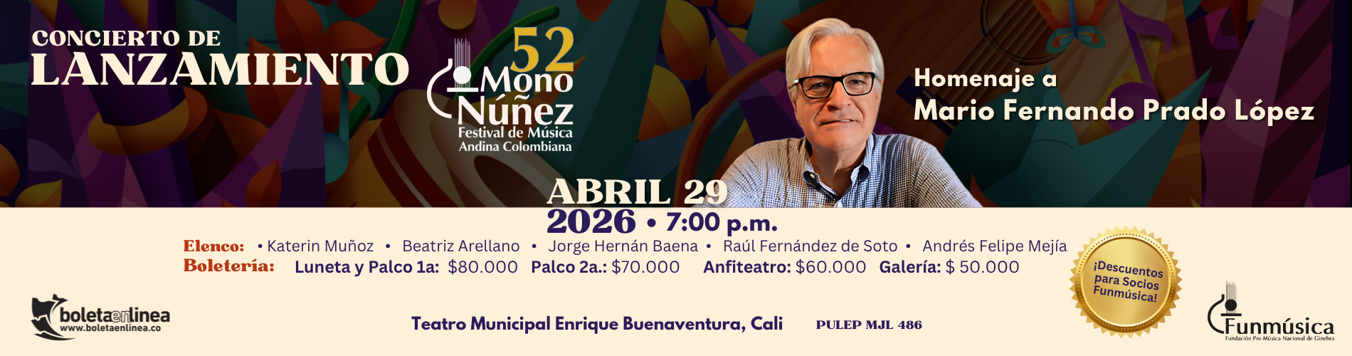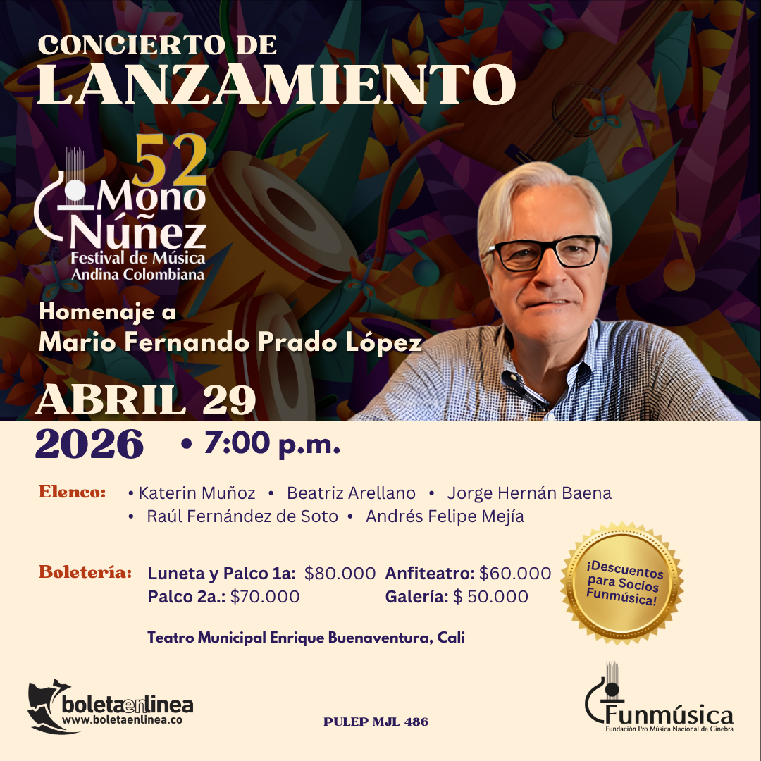 CONCIERTO DE LANZAMIENTO DEL 52° FESTIVAL MONO NÚÑEZ QUE SE REALIZARÁ DEL 25 AL 28 DE JUNIO EN GINEBRA VALLE DEL CAUCA. EN EL CONCIERTO SE REALIZARÁ UN HOMENAJE A MARIO FERNANDO PRADO LÓPEZ, FIGURA EMBLEMÁTICA DE LA CIUDAD DE CALI. – PREVENTA CON DESCUENTO HASTA EL 22 DE ABRIL DE 2026 DEL 10% PÚBLICO EN GENERAL Y DEL 20% PARA SOCIOS FUNMÚSICA (deberán comunicarse directamente con la Fundación para la aplicación del descuento previamente a la compra)
